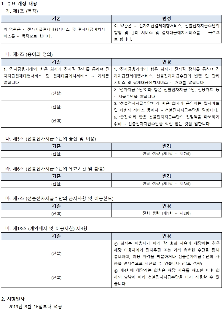세틀뱅크 전자지불 서비스를 이용해 주셔서 감사합니다. 아래와 같이 이용약관 변경사항을 확인하시고 서비스 이용에 참고 부탁드립니다.