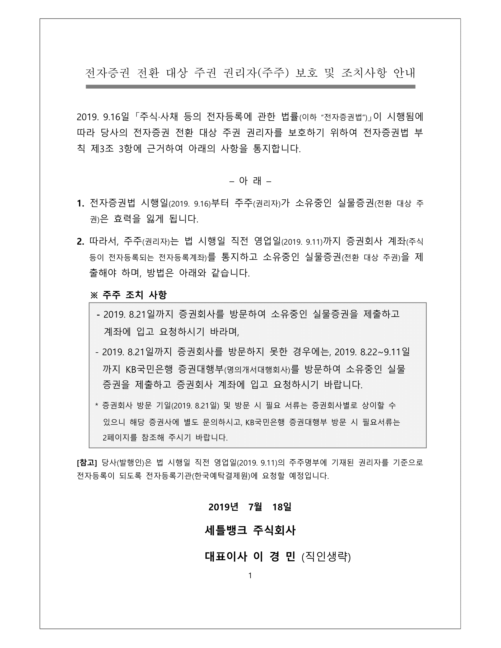 전자증권 전환 대상 주권 등의 권리자 보호를 위한 통지문