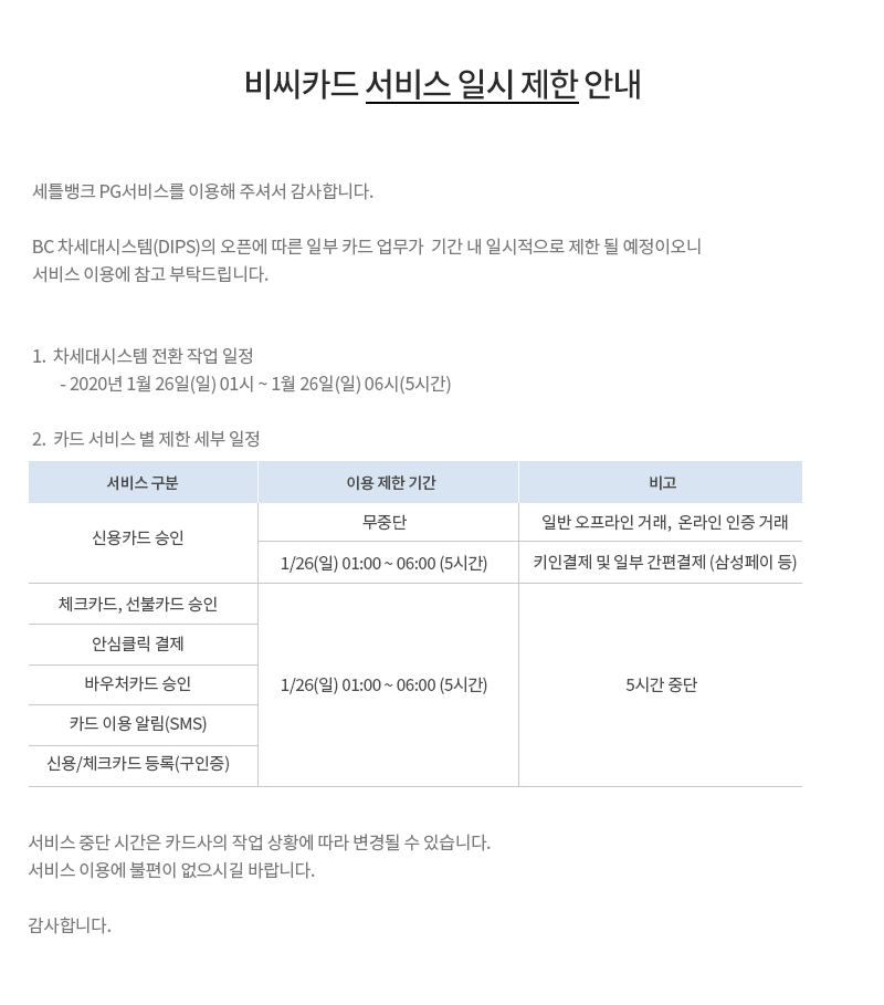 비씨카드 차세대시스템 전환에 따른 서비스 중단 안내