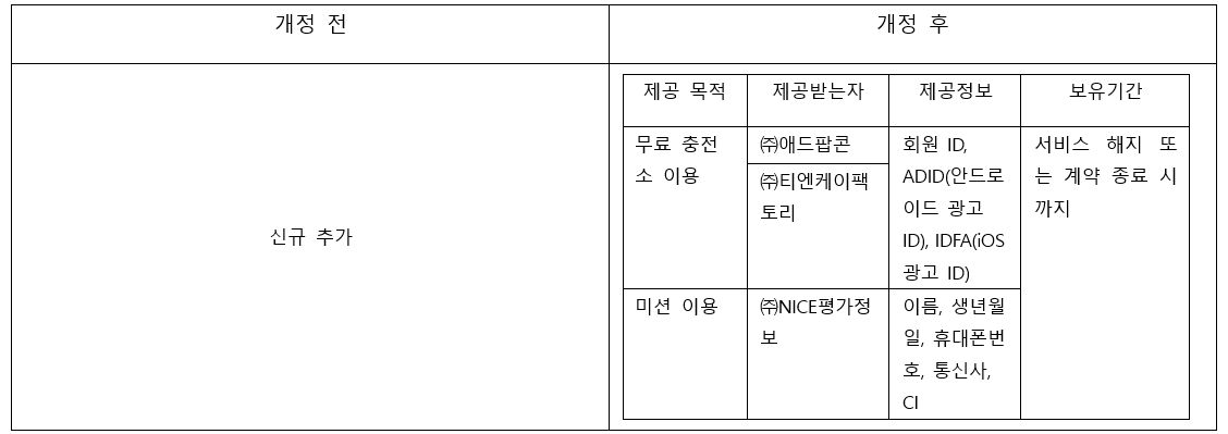 (1) 무료 충전소 제휴처 변경 및 수집 항목 수정
