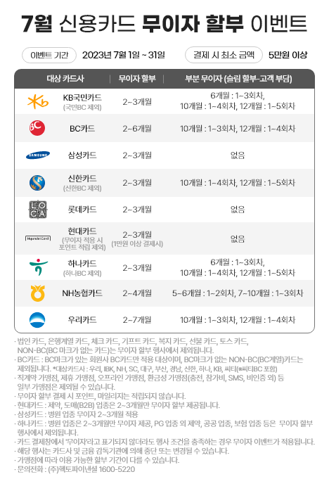 헥토파이낸셜 PG서비스를 이용해 주셔서 감사합니다. 2023년 7월 카드사 무이자 이벤트를 안내해 드리니 많은 이용부탁드립니다.