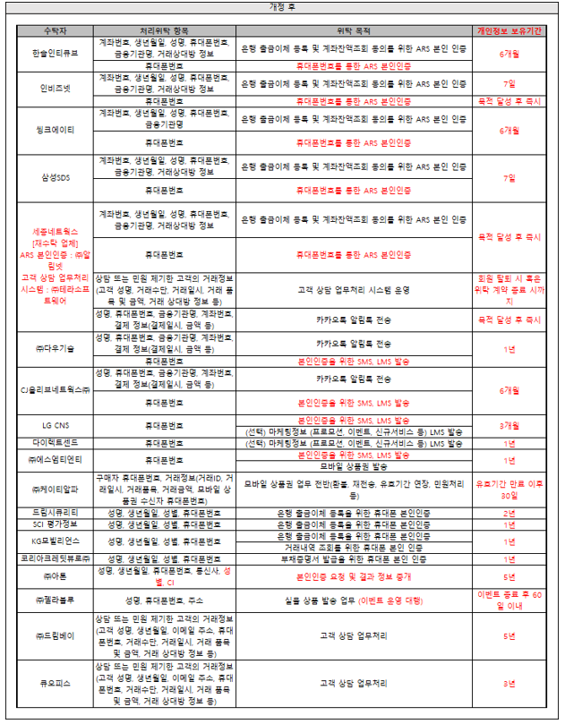 - 내용: 수탁자, 처리위탁 항목, 위탁 목적 현행화 및 개인정보 보유기간 항목 신규 추가