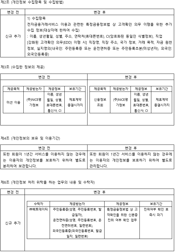 - 내용: 제공목적, 개인정보 관리 현행화, 고객확인 의무 이행에 따른 수집 항목 추가