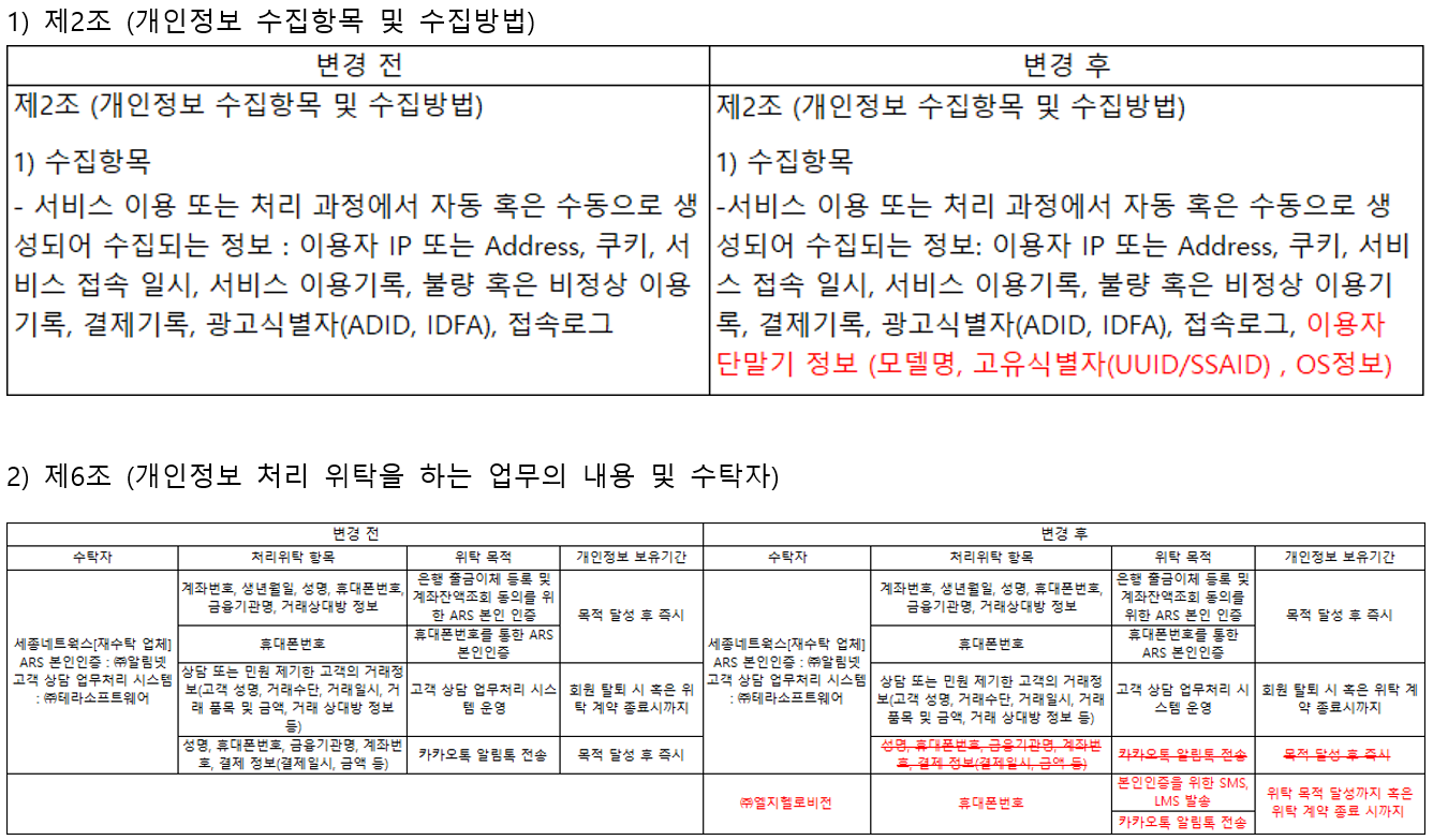 - 대상 : 제2조(개인정보 수집항목 및 수집방법), 제6조(개인정보 처리 위탁을 하는 업무의 내용 및 수탁자)