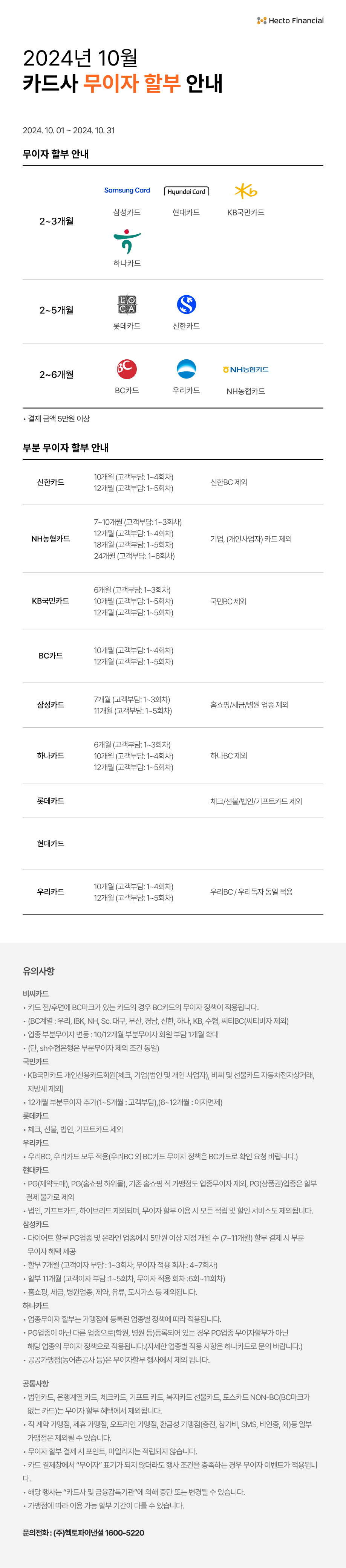 헥토파이낸셜 PG서비스를 이용해 주셔서 감사합니다. 2024년 10월 카드사 무이자 이벤트를 안내해 드리니 많은 이용부탁드립니다.