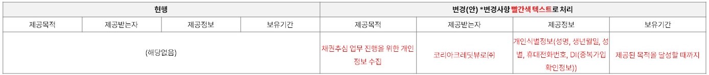 - 대상 : 제1조(개인정보의 수집 및 이용 등 처리 목적), 제3조(1) 개인(신용) 정보의 제3자 제공 (필수), 제6조(개인정보 처리 위탁을 하는 업무의 내용 및 수탁자)